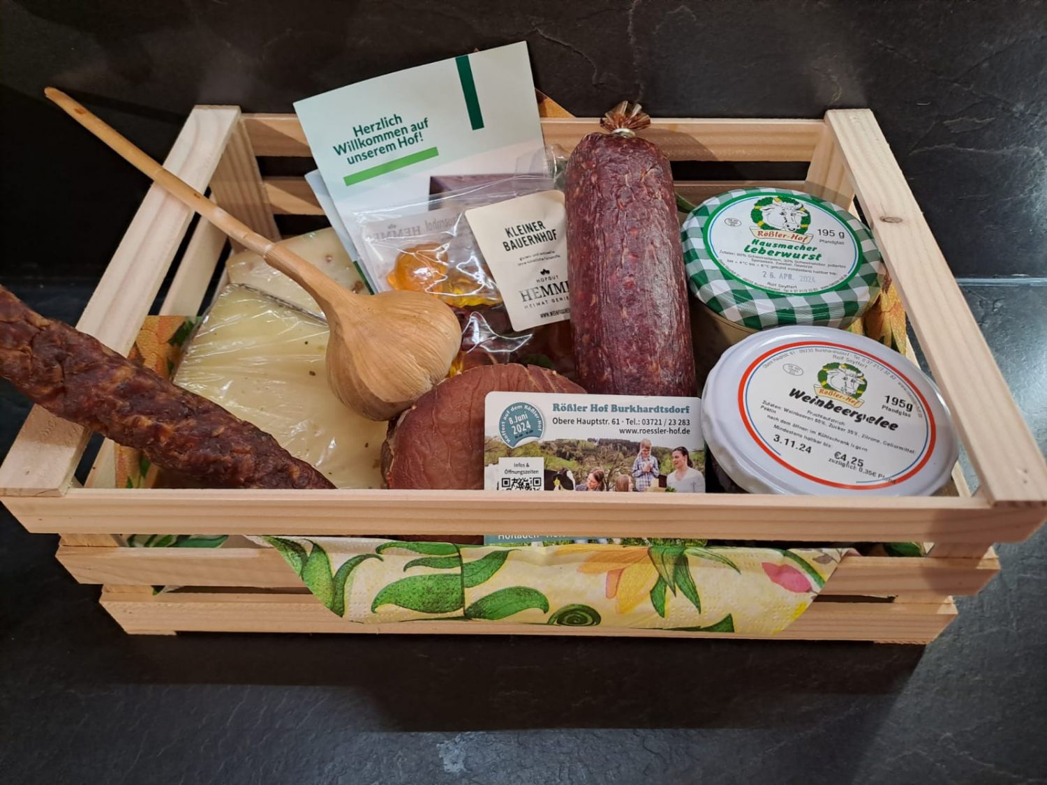 1 Kümmelbratwurst vom Schwein, 1 Tüte Gummibärchen, 1 Rollschinken, 1 hausgemachte Marmelade &